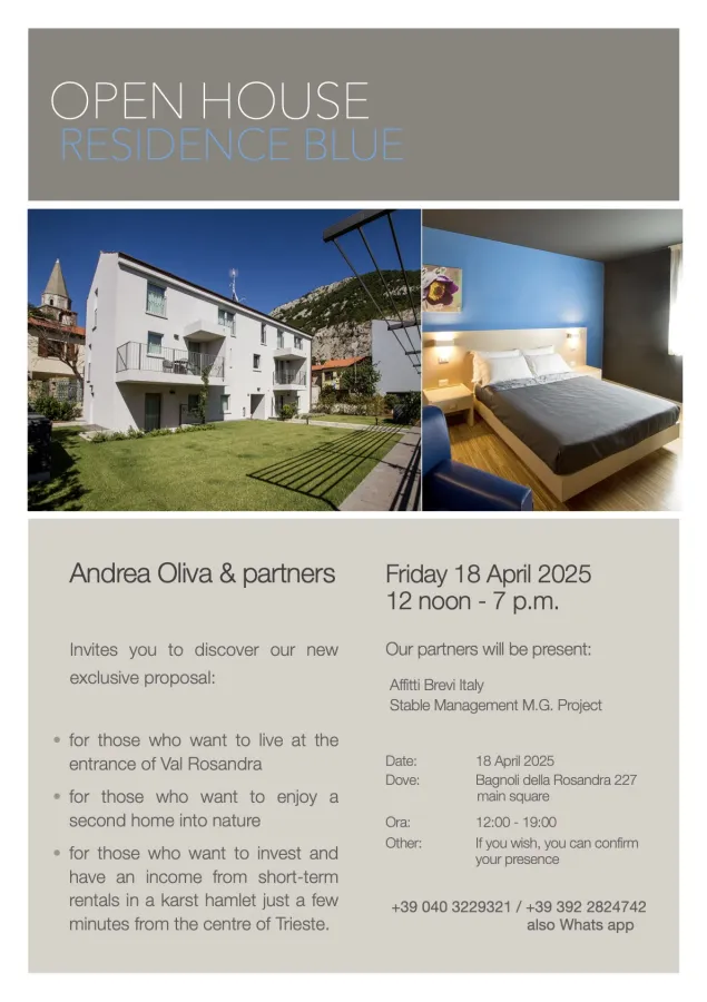 The Open House will be held in Bagnoli della Rosandra, 227 (main square) on Friday 18 April 2025, from 12.00 to 19.00.